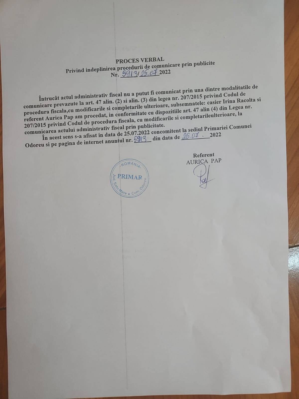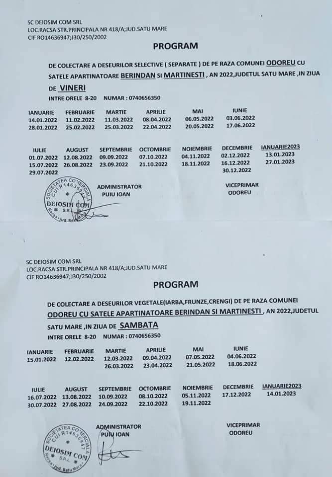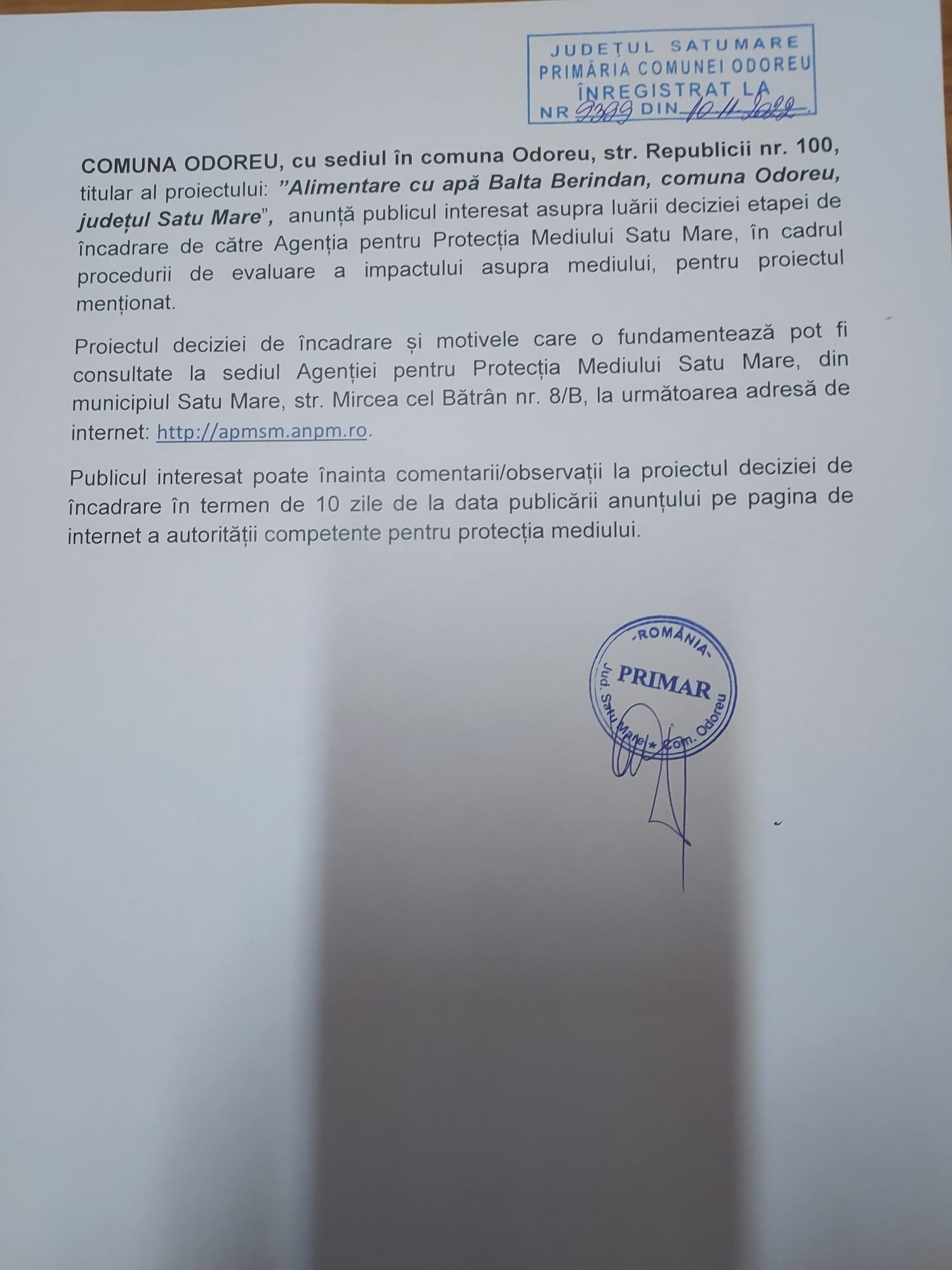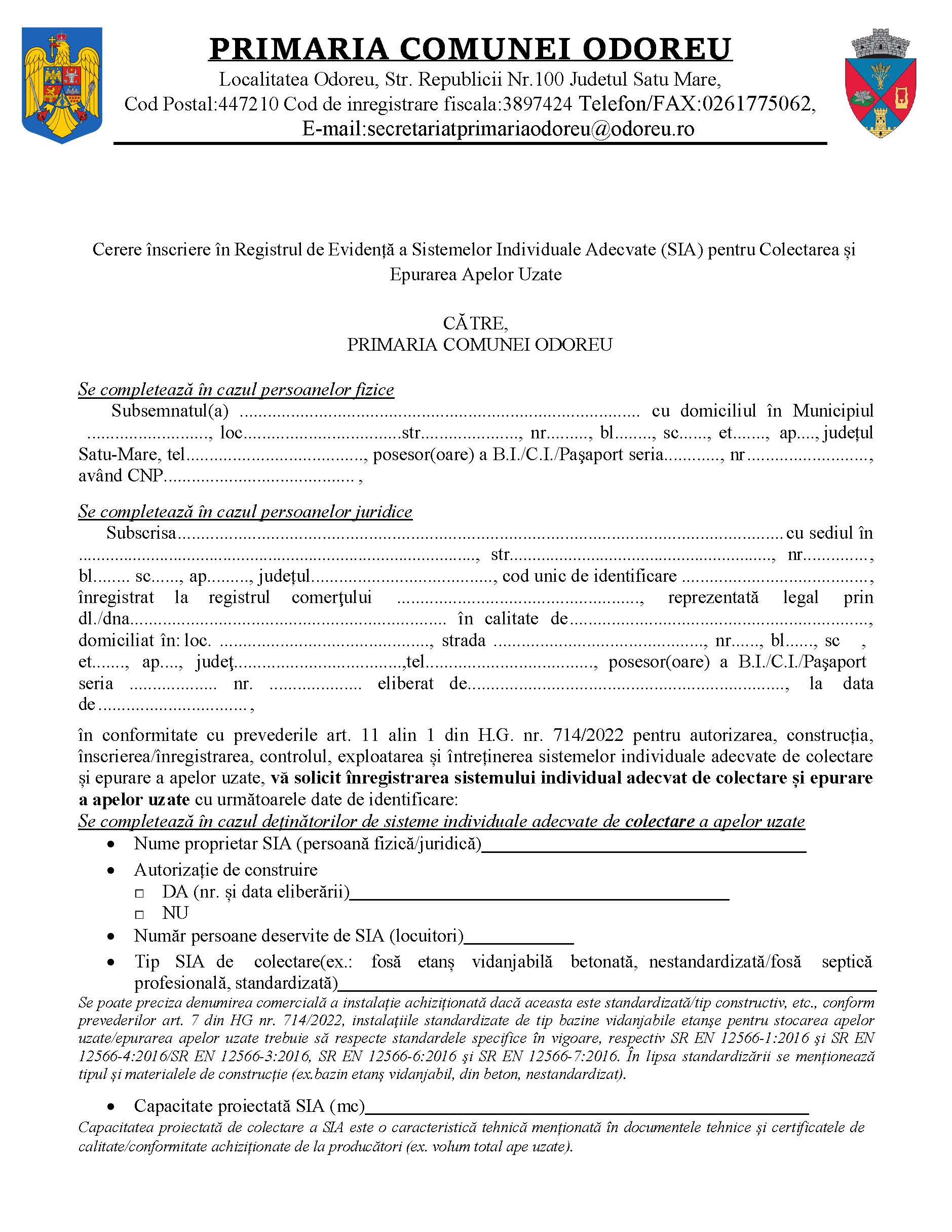 Solicitarile pentru inscriere in registrul de evidenta a sistemelor individuale adecvate (S.I.A) pentru colectarea apelor uzate se vor depune la sediul Primariei Comunei Odoreu, din loc. Odoreu, str. Republicii, Nr. 100, in fiecare zi de luni pana joi intre orele 08.00 si 15.30 respectiv vineri intre orele 08.00 si 14.00.