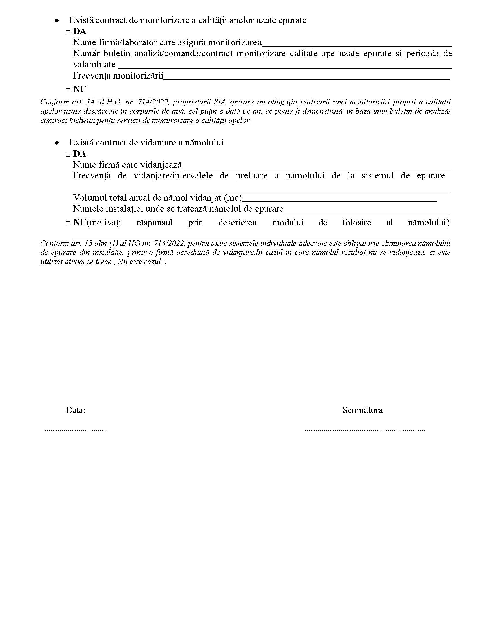 In conformitate cu prevederile art. 11 alin 1 din H.G. nr. 714/2022 pentru autorizarea, construcția, înscrierea/înregistrarea, controlul, exploatarea și întreținerea sistemelor individuale adecvate de colectare și epurare a apelor uzate, vă solicit înregistrarea sistemului individual adecvat de colectare și epurare a apelor uzate.
